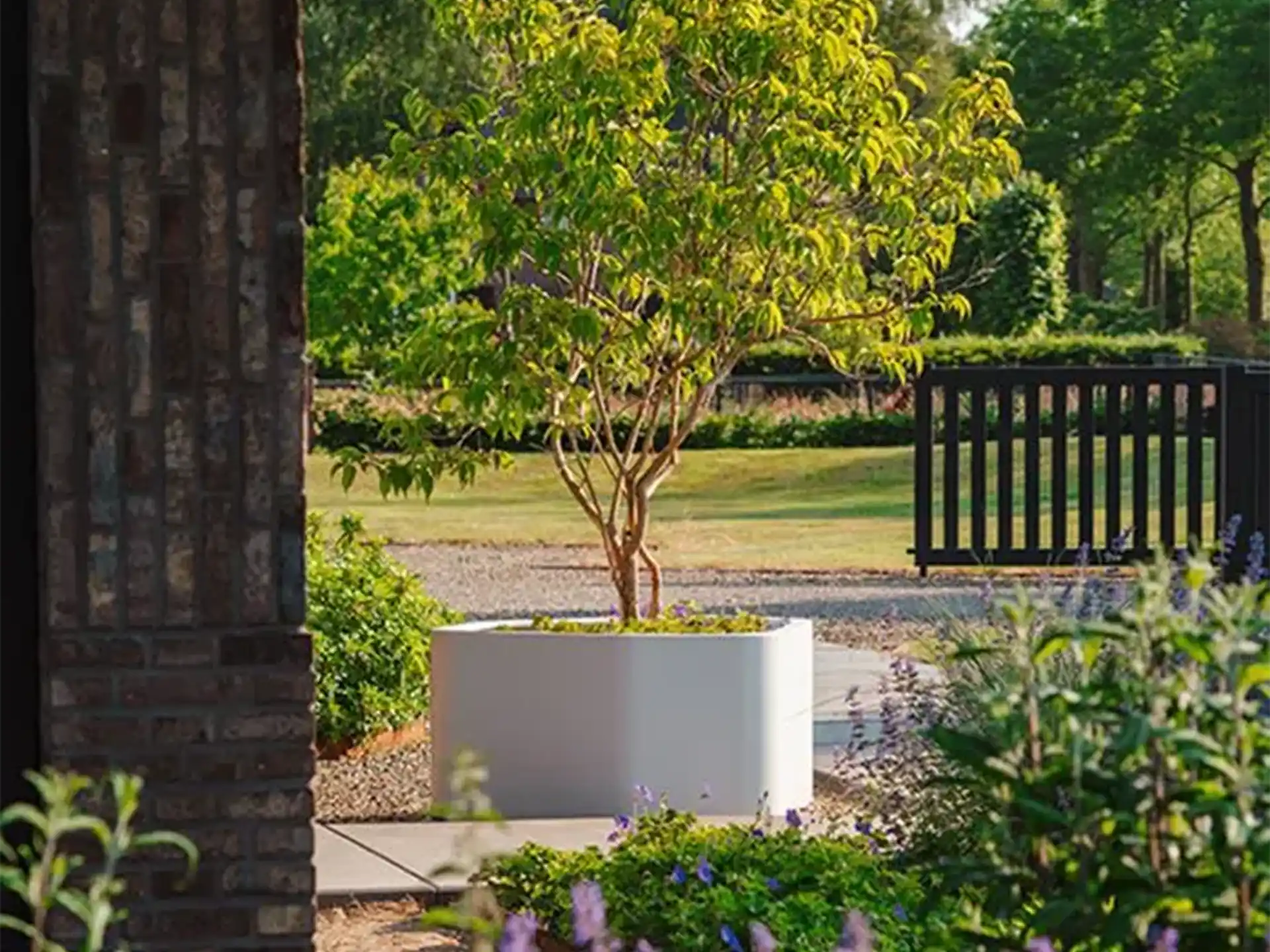 Een mooi ingerichte tuin met polyester plantenbakken